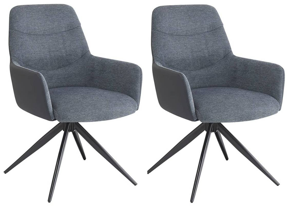 The Hester arm chair features padded gray fabric and synthetic leather seats with supportive backs, sleek black iron legs, and a contemporary design. Comfortable and durable, it enhances modern dining spaces with understated elegance and everyday practicality.Read More