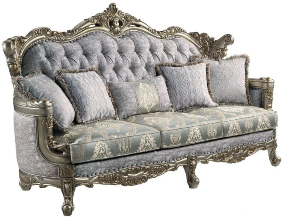 It helps to secure the padding or cushioning underneath, preventing it from shifting or sagging over time. The nailhead trim accentuates the beauty of any piece of this piece. The two-tone fabrics and bronze finish modernize the traditional style of this sofa and gives it an edge. Five throw pillows are included.
