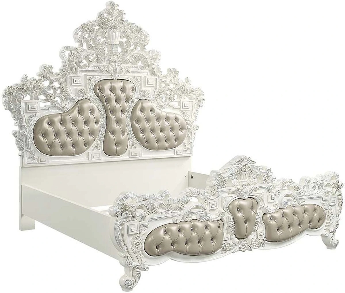 Luxurious style, sophisticated charm, and lustrous finishes are all included in the Vanaheim Bedroom Collection. Extravagant scroll floral design with gold trim accent creates classic appeal and timeless silhouettes. Button tufted headboard and footboard add texture and dimension to the panel bed.Read More