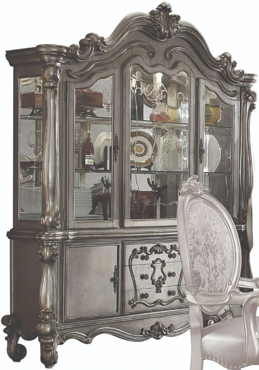 Irresistibly inviting, the Versailles collection displays the unrivaled beauty of traditional dining. The hutch and buffet reflect impressive decorative trim moldings and leaf brown with oversized scrolled feet. It features a touch-light function to light up your china display.Read More