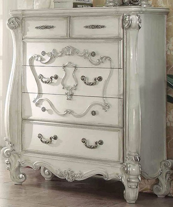 The Versailles chest is the perfect accent to create the style of royalty your bedroom has been needing. This chest crafted in wood with bone white finish was inspired by old European design with metal hardware and intricate wood carvings on the front of the five drawers.Read More