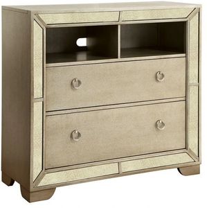 The Loraine champagne media chest by Furniture of America brings elegant sophistication to your bedroom. Finished in a warm champagne tone with mirrored accents and crystal-style hardware, it features spacious drawers and open media compartment perfect for stylishly organizing electronics, décor, and everyday essentials.Read More