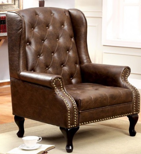 For those in need of an accent piece that is both comfortable and luxurious, this chair is the perfect choice. The chair features button tufting and nailhead trim. Upholstered in rustic brown leatherette for that attractive, worn-out look.