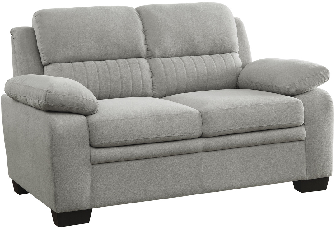 A modern profile serves to lend visual contrast and support to the plush seating and pillow-top arms of the Holleman collection. The gray textured fabric cover acts as a neutral palette for your decorative preferences. Channel tufting accents the lower seatback of the love seat providing subtle accent to the collection.Read More
